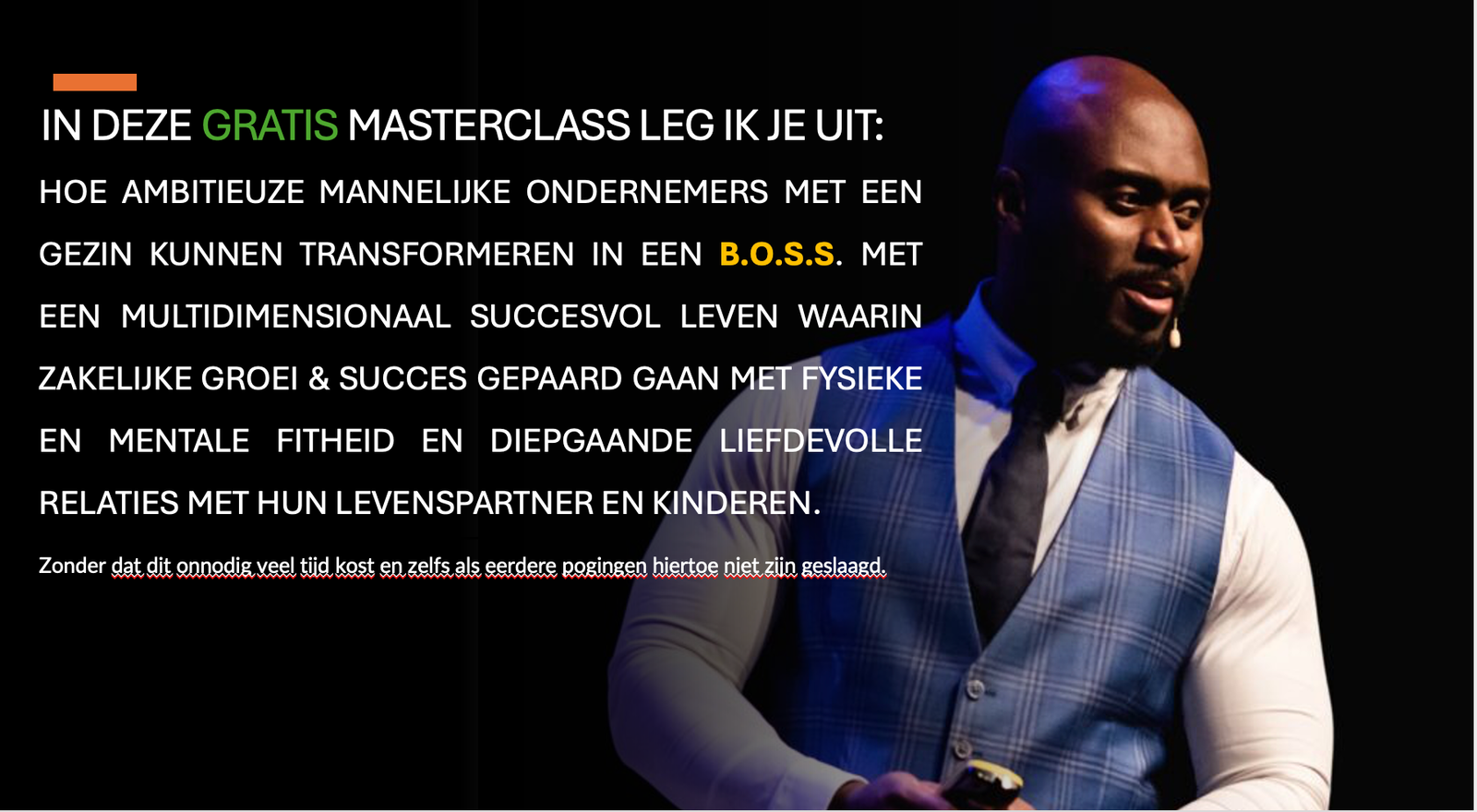 Als mannelijke ondernemer met een gezin leidt je een uitdagend leven met veel verantwoordelijkheden. Dit is niet voor een ieder weggelegd. Maar jij schuwt niet weg voor een uitdaging. Je hebt drive en ambitie. En er zijn dromen en doelen die je wilt realiseren voor jezelf en je gezin. Je ervaart zakelijk succes en groei, maar dit begint steeds meer zijn tol te eisen op je gezondheid, relatie of huwelijk en jouw vaderschap. Dit was nooit de bedoeling, maar je bent bereid de situatie te herstellen of je wilt verdere schade voorkomen door de nodige veranderingen aan te brengen in jezelf en in je leven. Je wilt zowel succes in je business als gezinsleven ervaren maar je zal voor dit multidimensionale succes moeten transformeren in een B.O.S.S. en multidimensionale leider. In deze hoogwaardige BECOME A B.O.S.S. Masterclass leer ik jou, net zoals mijn bijzonder succesvolle cliënten, hoe jij jezelf een krachtige B.O.S.S. Identiteit aanmeet. Kosteloos, want ik ben graag van waarde voor je. Dus ga er goed voor zitten en doe er je voordeel mee. Een nieuw level en uitzonderlijk succes als man, ondernemer en leider wacht op je. Maar je zal hiervoor moeten veranderen in de kern. Nu onthul ik hoe ook jij dit kunt doen!