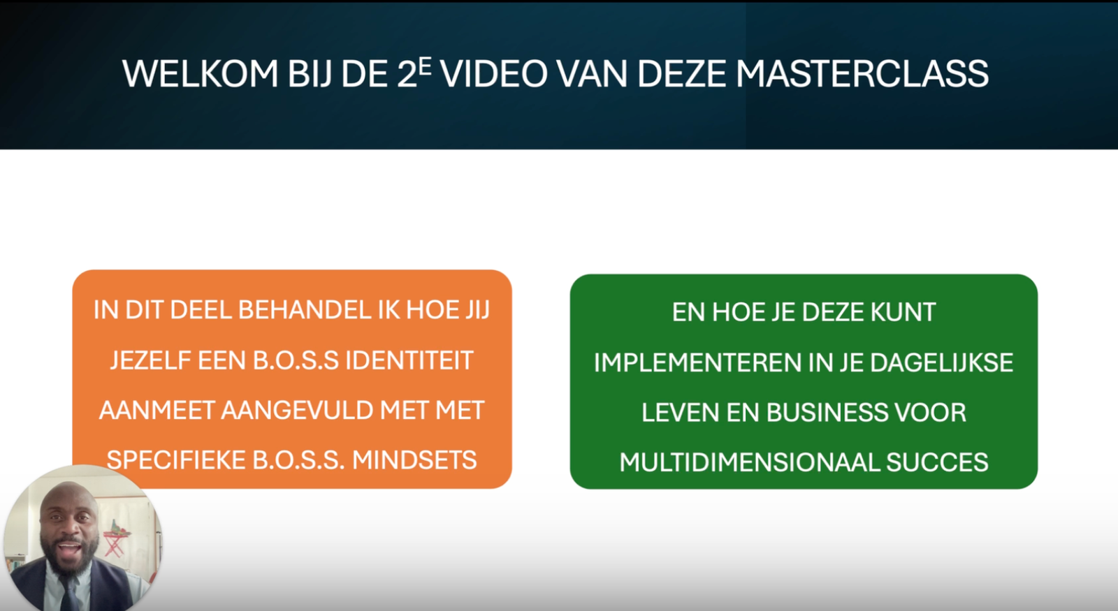 Oké, je weet nu hoe het mentale proces in elkaar steekt, als het gaat om het veranderen en verbeteren van jouw persoonlijkheid. Je weet wat een Kernidentiteit is en je hebt er nu bewust één gecreëerd die je in staat stelt om jouw ‘Noorderster’ in het leven te bereiken. Je hebt jouw nieuwe Kernidentiteit positief getoetst aan de vier B.O.S.S. Pijlers en deze voldoet aan het kaliber: B.O.S.S. IDENTITEIT. Vervolgens heb je als verlengstuk van jouw B.O.S.S. Identiteit jouw B.O.S.S. Mindsets gecreëerd voor de vier vitale levensdimensies. Helemaal top! Maar hoe implementeer je deze gouden kennis nu in je dagelijkse bestaan? Hoe maak jij jouw nieuwe B.O.S.S. Identiteit je eigen in een relatief korte tijd zodat je multidimensionaal succes kunt ervaren in je professionele en persoonlijke leven? Exact dit leg ik je uit in deze tweede en belangrijke video van de BECOME A B.O.S.S. MASTERCLASS. Dus ga er weer goed voor zitten, want wat je nu gaat ontdekken is wellicht de krachtigste en meest praktische informatie over blijvende gedragsverandering en identiteitstransformatie die je tot nu toe hebt gehoord. Enjoy!